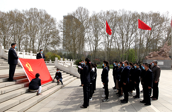 3月31日上午,在五分公司党总支的组织下,机关第一、二党支部在家党员、团员青年、群众共三十余人统一着装,徒步来到华北军区烈士陵园,开展“缅怀英烈 爱国教育”主题党日活动。为了让团员青年、群众都受到教育,此次活动范围扩大到了全体职工。在纪念碑前,全体职工向长眠在此的烈士们致默哀、三鞠躬,之后整齐列队、缓步向烈士们献上自己亲自动手制作的小白花,随后面向纪念碑,右手举拳,在党总支书记贾银建领誓下,立足岗位郑重宣誓。