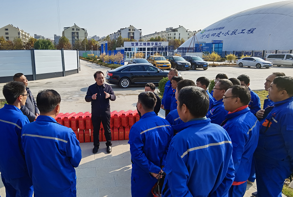 在会议室,结合项目施工情况,董富强强调,要坚持高标准定位、严要求管理,在安全、质量、成本等方面做到“六个强化”,建成四建品牌工程,展现公司良好形象。一是强化安全管控,提高政治站位,落实文明施工、扬尘防治各项要求;时刻绷紧安全这根弦,采取多种形式狠抓现场安全教育培训,进一步增强全员安全意识。二是强化质量管理,对于正在施工的综合楼,工程体量大,质量标准要更高、过程管理要更细,务必压实各方责任,严格按照方案组织施工。三是强化成本管控,从材料采购到劳务单价等各个环节,都要精细化管理,积极采用新技术、新工艺,促进降本增效,提高项目盈利水平。四是强化人才培养,要树立建楼育人理念,着力发挥“师带徒、老带新、传帮带”作用,助力青年职工成长成才。五是强化宣传工作,凝聚思想共识,营造干事创业浓厚氛围。六是强化劳务实名制管理,有效规避用工风险,做好维稳工作。